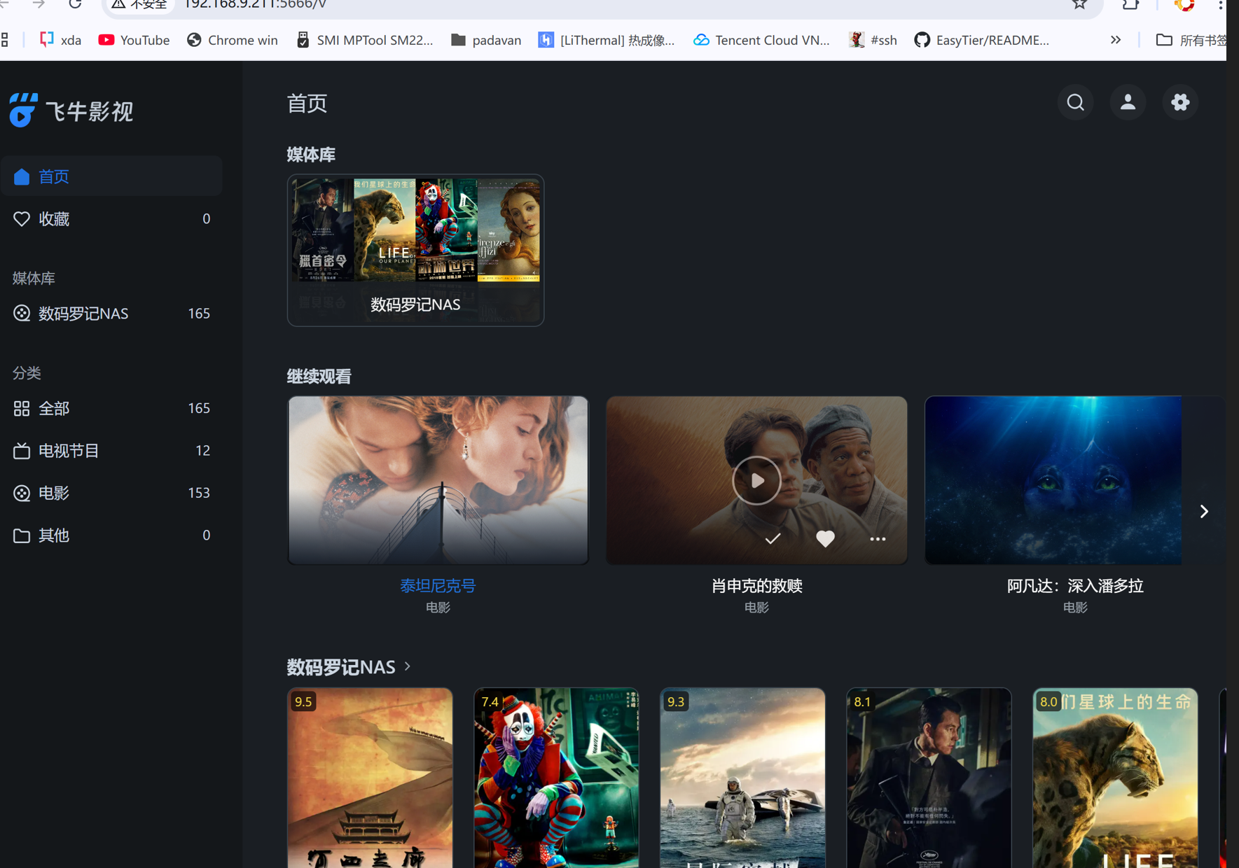 安装完 Emby 后,导入了本地电影库(约 600+ 部影片),包括高清 MKV、H.264/H.265 编码视频。