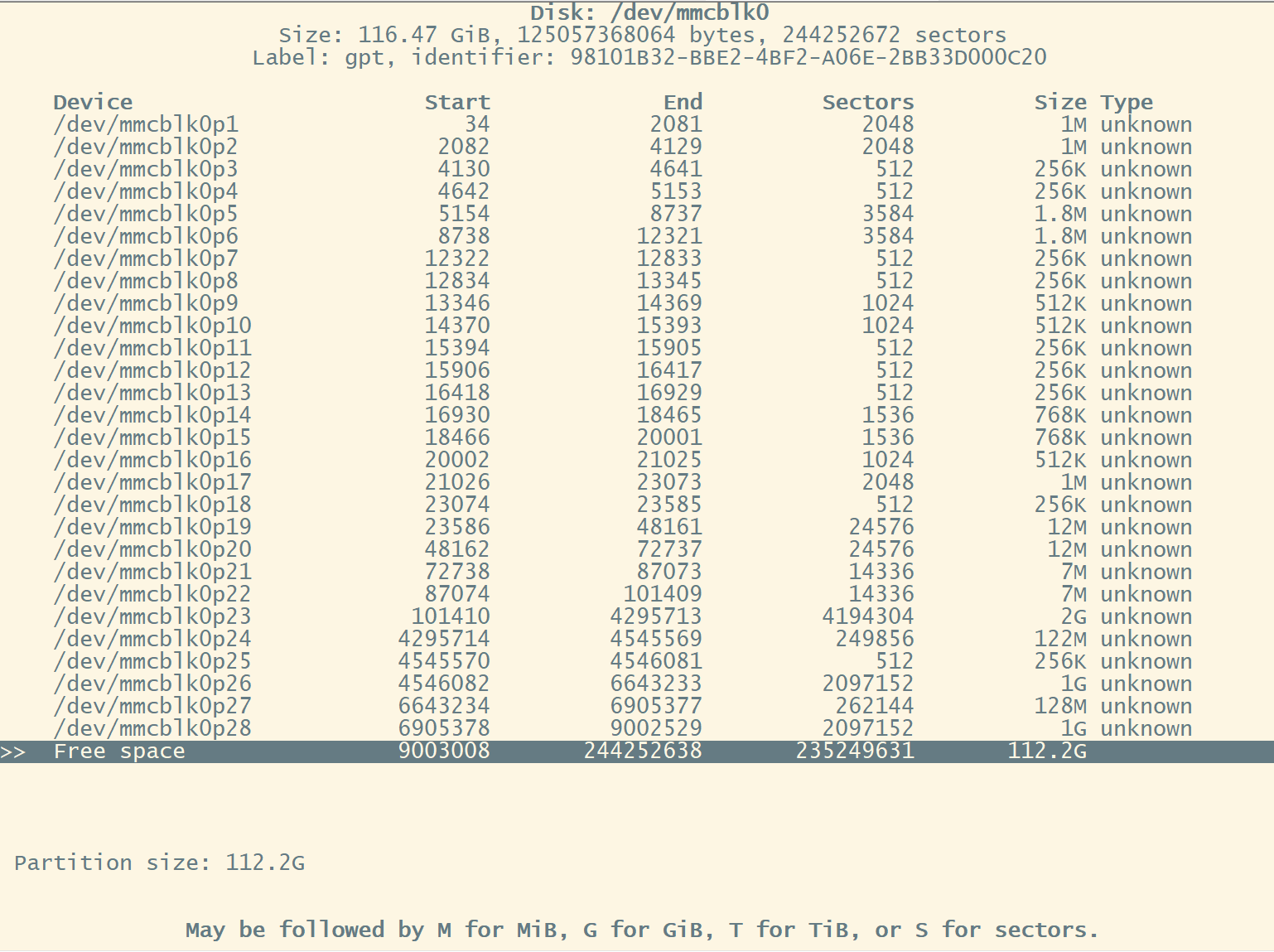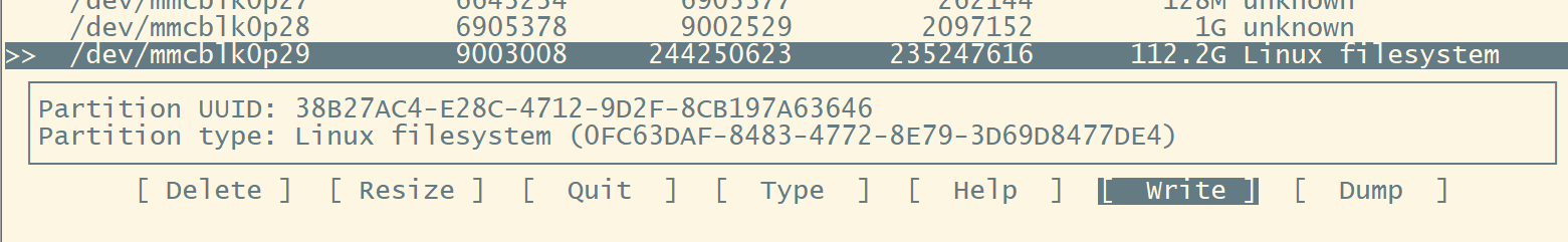 刷了分区表的 后面大分区是未知状态的 需要 继续 cfdisk /dev/mmcblk0