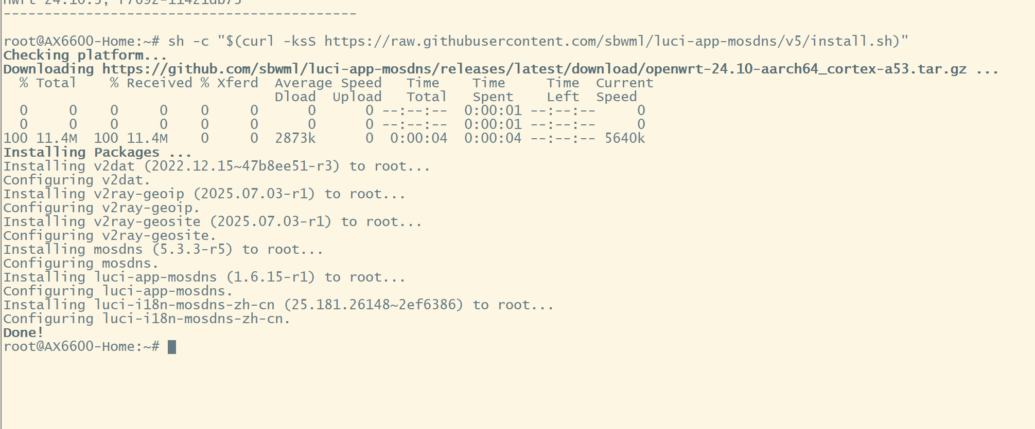sh -c "$(curl -ksS https://raw.githubusercontent.com/sbwml/luci-app-mosdns/v5/install.sh)"带加速 via ghproxy:
