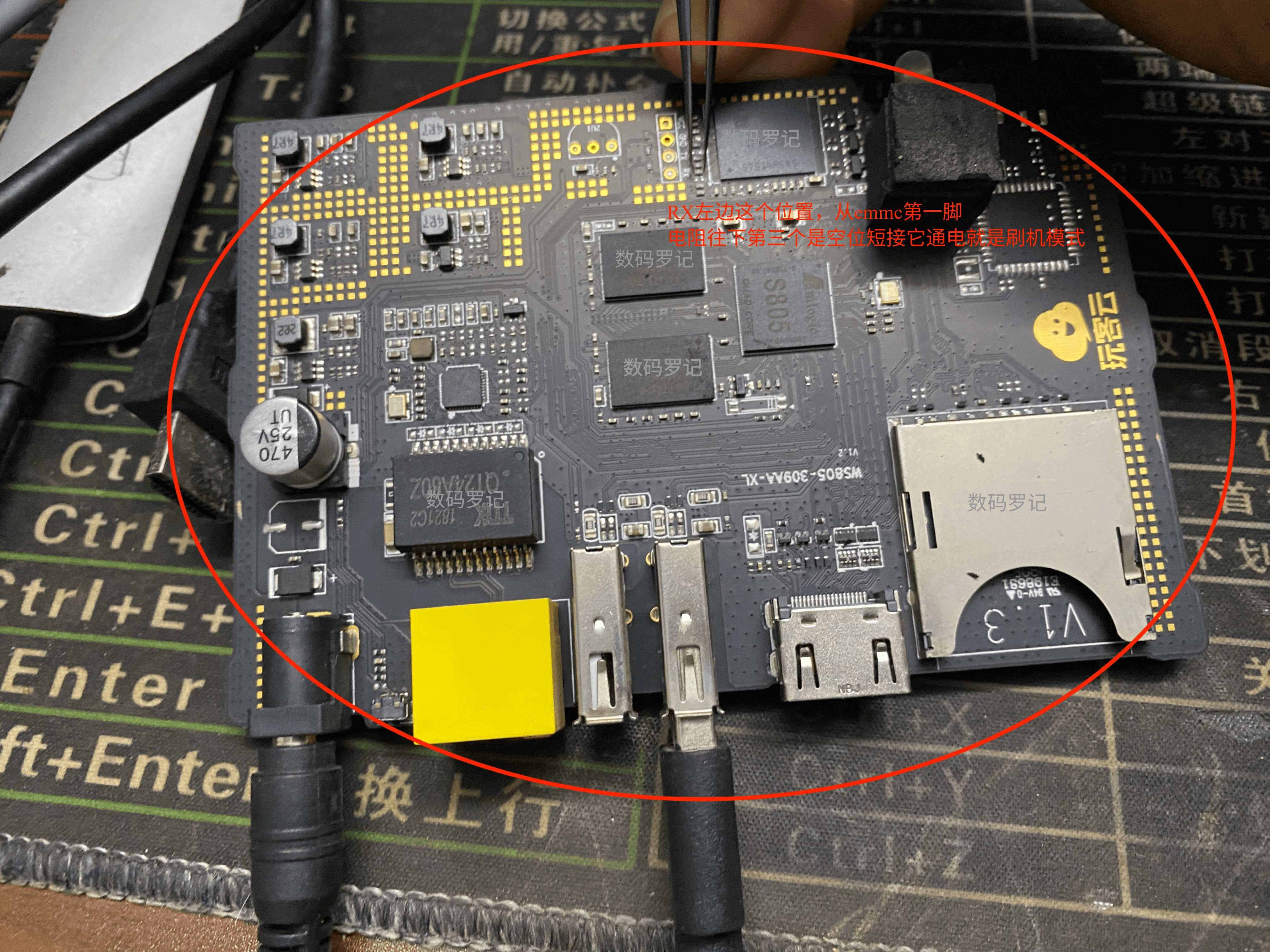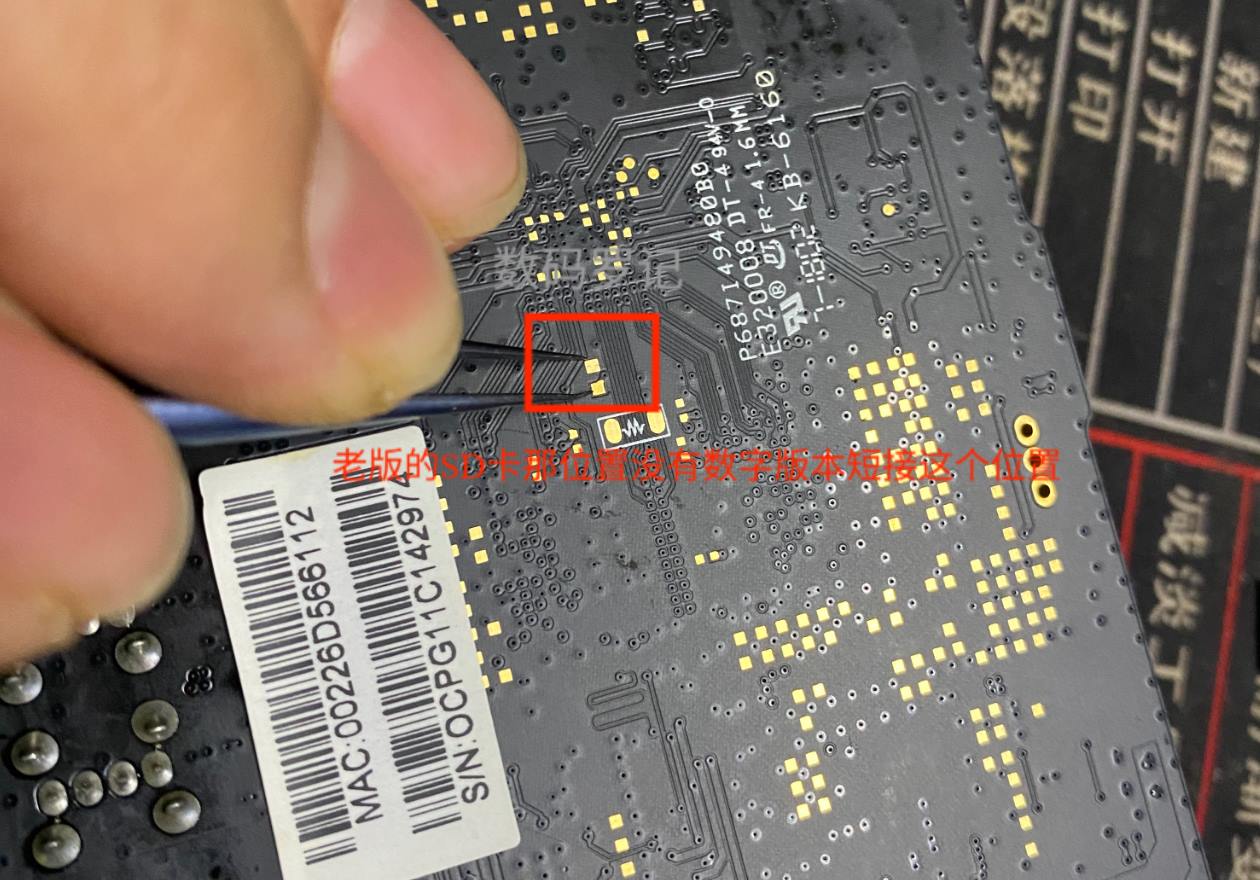SD卡下有V1.3版本的在 emmc一脚那个点的位置 从那一排的电阻往下第三位置是空的短接 ,看图