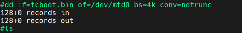 dd if=tcboot.bin of=/dev/mtd0 bs=4k conv=notrunc