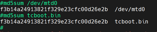 md5sum /dev/mtd0 && md5sum tcboot.bin