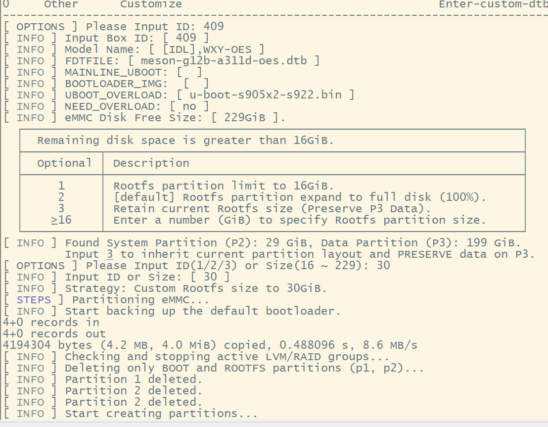 [ INFO ] Found System Partition (P2): 29 GiB, Data Partition (P3): 199 GiB.