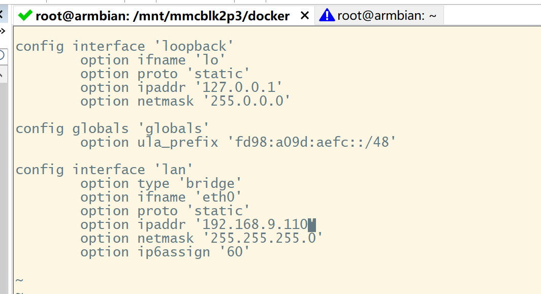 docker exec -it openwrt vi /etc/config/network #安装上面的我的报错 不知道是不是aarch64的问题 我改了这个直达的